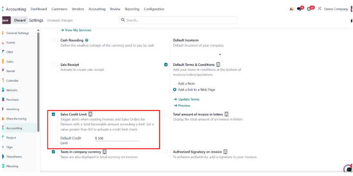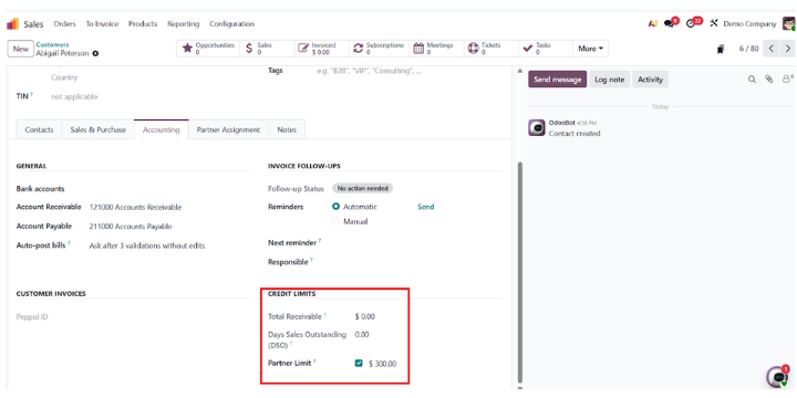 Odoo 19 Accounting solves this with its Sales Credit Limit feature, allowing businesses to define, monitor, and control customer credit in real time.